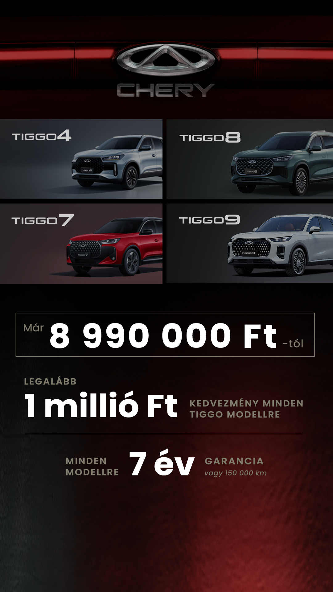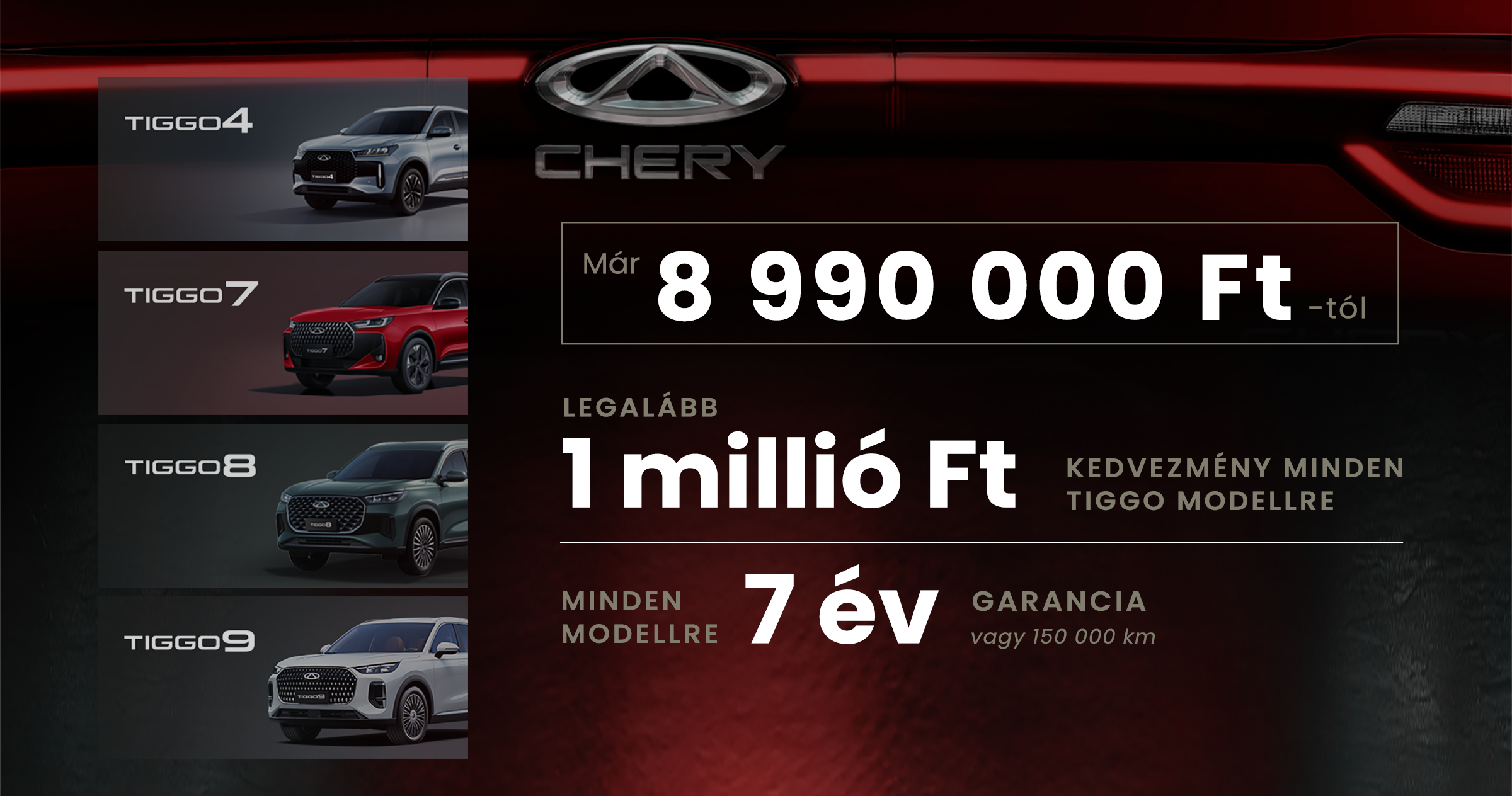 A feltüntetett árak kizárólag tájékoztató jellegűek, márkakereskedésenként eltérhetnek, és nem minősülnek kötelező érvényű ajánlatnak. Az ajánlat és a járműkínálat változtatásának jogát fenntartjuk. A képek illusztrációk. További információk a Chery márkakereskedéseknél, valamint a cherymotors.hu weboldalon.